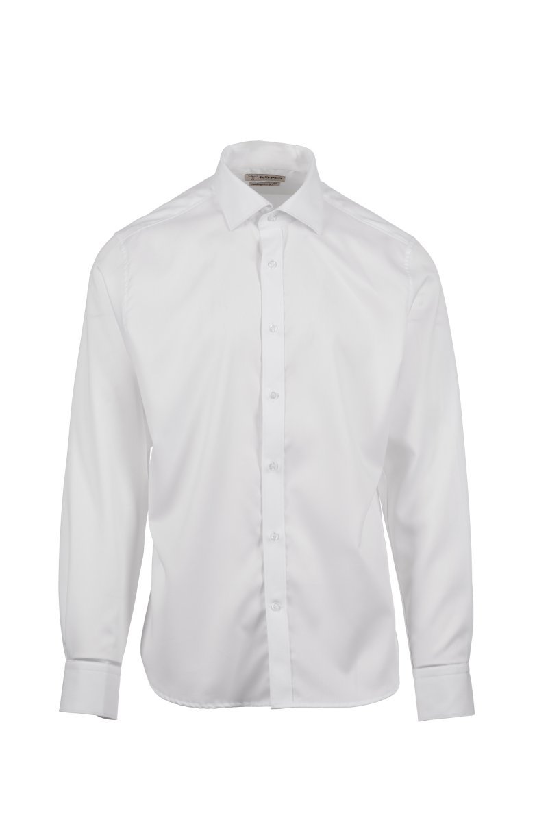 Langermet skjorte, moderne passform. Formet semi-fransk krage, med lukket knytebåndplass foran og avtagbare stag. Synlig sydd boksplissering. Knapper med perlemorseffekt. Bærestykke på ryggen. Foldet plissering midt på ryggen. Stofforsterkning på hofter. Avrundede mansjetter med to knapper.