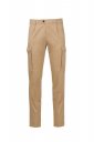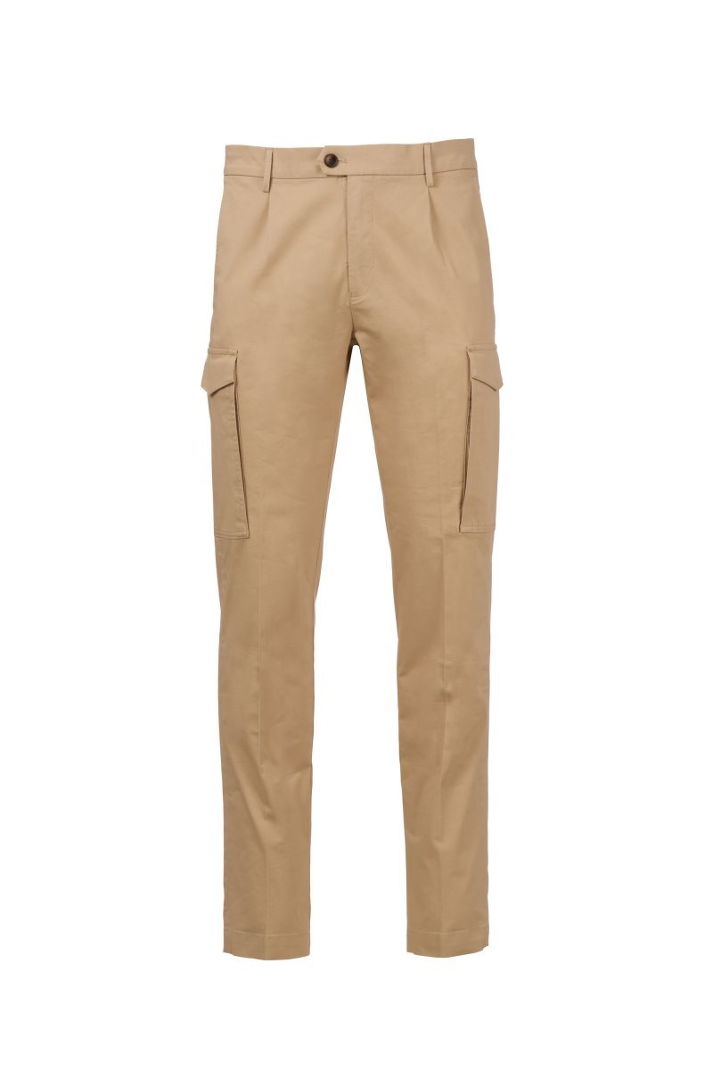 Sommerchinos i stretchgabardin, moderne passform, med skreddersydde beltehemper, glidelåslukking og asymetrisk knapping med to knapper. To franske lommer, to sidelommer med klaff og trykknapp. To baklommer med klaff og trykknapp. Propellformet nagle på høyre side.