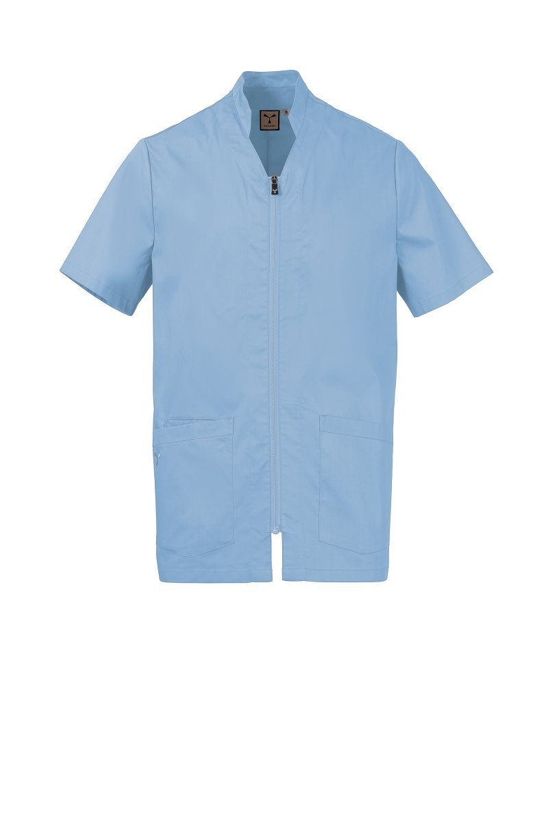 Kortermet arbeidsfrakk til herre, med mandarinkrage og et hint av en V-form, laget av bomullspoplin, polyester og Lycra® T400®, kombinert med et behagelig nettingstoff på sidene, for å sikre maksimal pusteevne og bevegelsesfrihet. Sentral åpning med glidelås og tilpasset trekker. To store påsatte lommer, én med den ikoniske Payper-broderte propellen ton-i-ton og en innerlomme med smarttelefonholder. Rygg med sentralt snitt.
