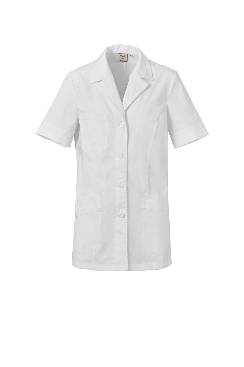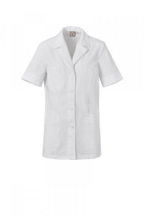 Kortermet arbeidsfrakk med klassisk jakkekrage til dame, laget av bomullspoplin, polyester og Lycra® T400®, med utmerkede elastiske og pustende egenskaper. Synlig knepping med 4-hullsknapper. Tre påsydde lommer: en på brystet med et pennerom; to lavere lommer, én med den ikoniske broderte Payper-propellen ton-i-ton og en innerlomme med smarttelefonholder. Kontrastfargede stoffinnlegg nederst på ermene og lavere lommer. Rygg med sentralt snitt og fast halvbelte i midjehøyde, for bedre å følge silhuetten.