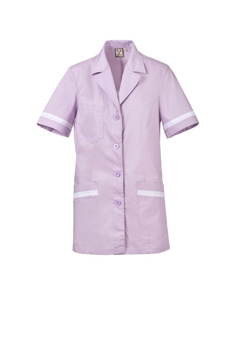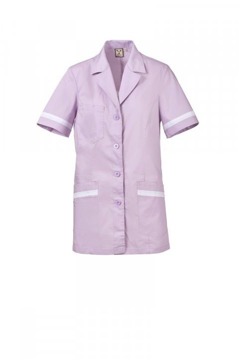 Kortermet arbeidsfrakk med klassisk jakkekrage til dame, laget av bomullspoplin, polyester og Lycra® T400®, med utmerkede elastiske og pustende egenskaper. Synlig knepping med 4-hullsknapper. Tre påsydde lommer: en på brystet med et pennerom; to lavere lommer, én med den ikoniske broderte Payper-propellen ton-i-ton og en innerlomme med smarttelefonholder. Kontrastfargede stoffinnlegg nederst på ermene og lavere lommer. Rygg med sentralt snitt og fast halvbelte i midjehøyde, for bedre å følge silhuetten.