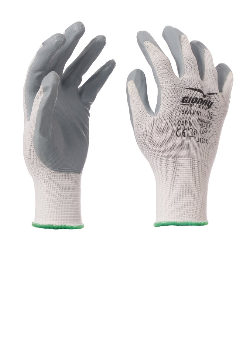 Belagt nitrilhanske, strikket mansjett, 13 G polyester. Egenskaper: svært motstandsdyktig. Styrker: komfort, fingerferdighet, grep, følsomhet, presisjon, væskebestandige. Bruksområder: lett, delikat bruk, presisjonsmontering og håndtering i tørre og våte miljøer i nærheten av hydrokarboner, smøremidler. Minimum salgbar enhet: 1 dusin (12 par). Kanten vil ha en annen farge avhengig av størrelsen.