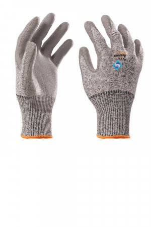 Kuttbestandige 13G hansker i HPPE-garn, strikkemansjett, polyuretanbelagt håndflate. Egenskaper: solid. Styrker: nivå D kuttbestandig (TDM-kutt)/A4 (ANSI/ISEA), komfort, grep, følsomhet, presisjon. Bruksområder: håndtering og montering av skjærende, tørre eller lett oljete gjenstander. Minimum salgbar enhet: 1 dusin (12 par). Kanten vil ha en annen farge avhengig av størrelsen.