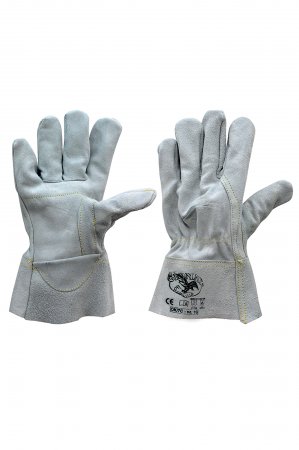 Hanske i splittet bovint skinn, dobbel håndflate, håndleddsbeskyttelse, tommelbeskyttelse, fingerinnsats, innvendig elastikk, 7 cm overerme, kevlar-søm. Egenskaper: solid, svært motstandsdyktig. Styrker: grep, beskyttelse. Bruksområder: håndtering av tungt bruk, egnet for kontakt med varmt, avslepen materiale.