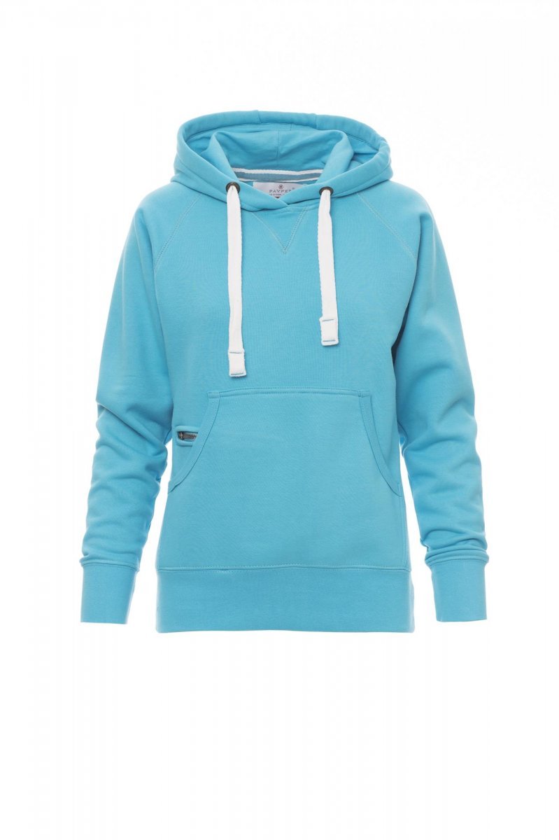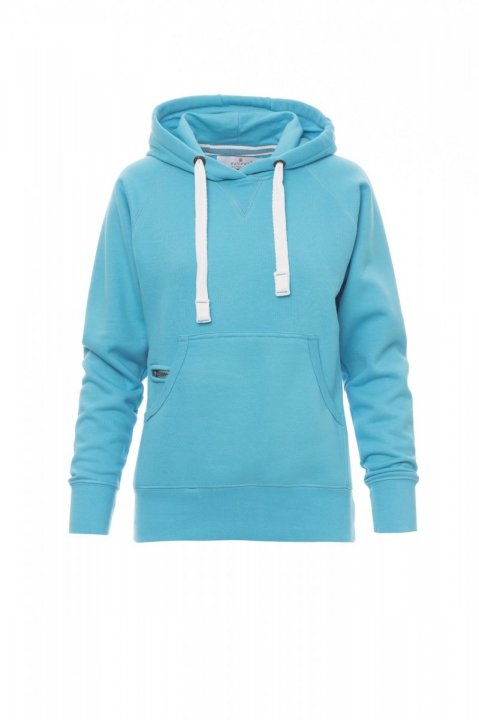 Bluza damska dopasowana z kapturem, z podwójnymi szwami i białym sznurkiem, z kontrastowymi przeszyciami i kółkami metalowymi, rękawy raglanowe, obszycie kołnierzyka w serek, kieszenie-kangurki, kieszonka na zamek błyskawiczny, mankiety i dół ze ściągaczem, wzmocnione szwy.