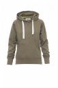 Bluza damska dopasowana z kapturem, z podwójnymi szwami i białym sznurkiem, z kontrastowymi przeszyciami i kółkami metalowymi, rękawy raglanowe, obszycie kołnierzyka w serek, kieszenie-kangurki, kieszonka na zamek błyskawiczny, mankiety i dół ze ściągaczem, wzmocnione szwy.