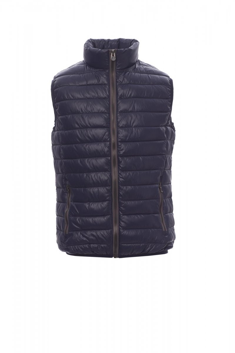 Męska kamizelka z wyściółką z wolnych włókien (160g/m²), zapinana na zamek błyskawiczny 8 mm z tworzywa sztucznego z metalowym suwakiem. Wąska lamówka w pasie. Dwie zewnętrzne kieszenie zapinane na zamek błyskawiczny. Trzy kieszenie wewnętrzne.