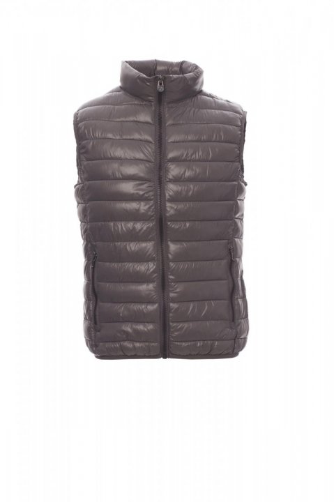 Męska kamizelka z wyściółką z wolnych włókien (160g/m²), zapinana na zamek błyskawiczny 8 mm z tworzywa sztucznego z metalowym suwakiem. Wąska lamówka w pasie. Dwie zewnętrzne kieszenie zapinane na zamek błyskawiczny. Trzy kieszenie wewnętrzne.