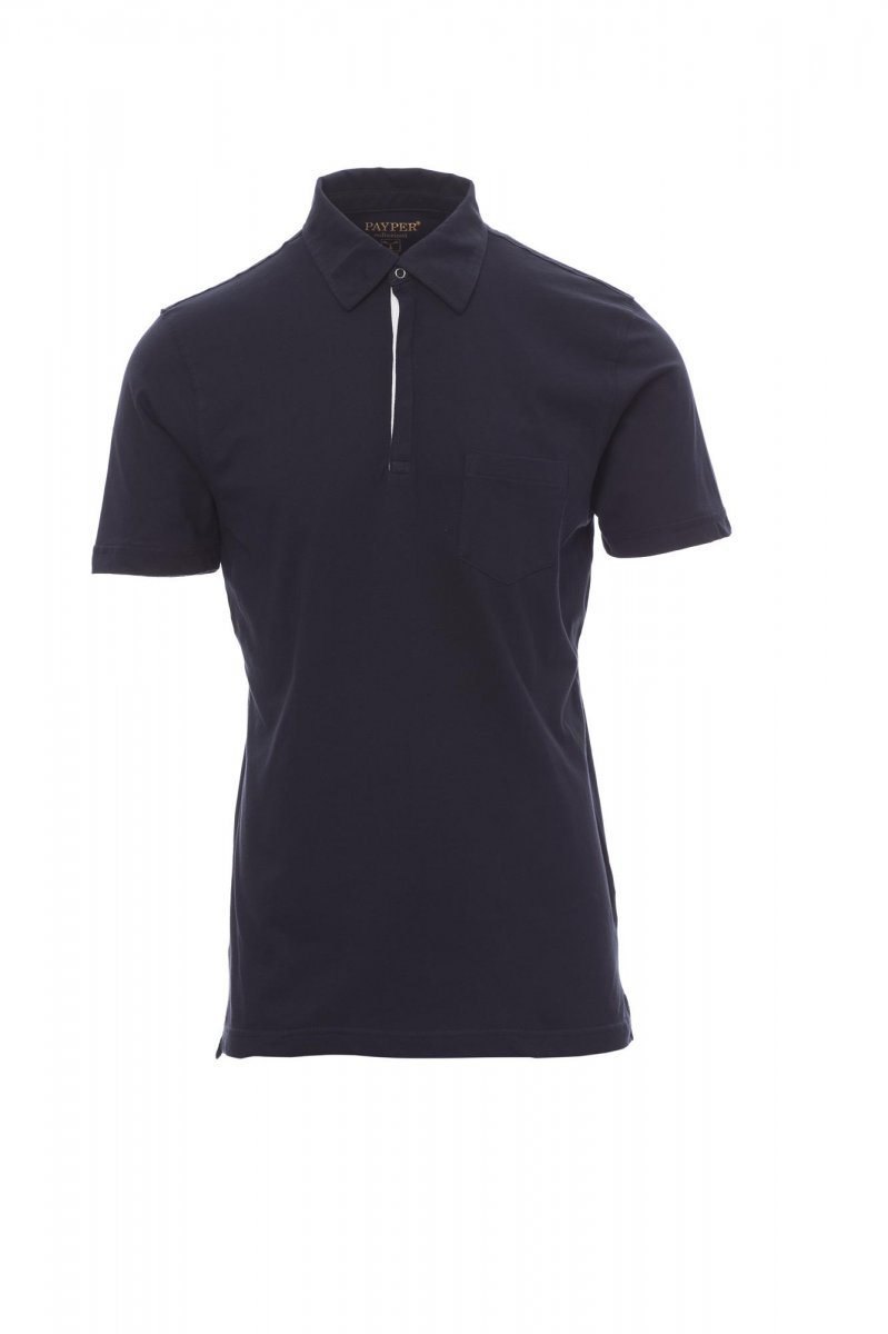 Koszulka polo męska z krótkim rękawem, zapinana na trzy zatrzaski, z głębokim dekoltem, kieszenią, kołnierzem koszulowym z dzianiny, etykietą termotransferową, taśmą na wewnętrznym obszyciu kołnierzyka