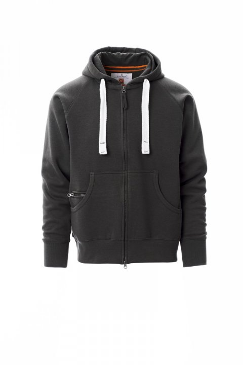 Bluza męska z kapturem, rozpinana, zamek błyskawiczny SBS wykończony plastikiem z podwójnym suwakiem metalowym, kaptur z podwójnymi szwami i białym sznurkiem, z kontrastowymi przeszyciami i kółkami metalowymi, rękawy raglanowe, kieszenie-kangurki, kieszonka na zamek błyskawiczny, mankiety i dół ze ściągaczem, wzmocnione szwy.