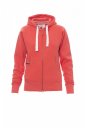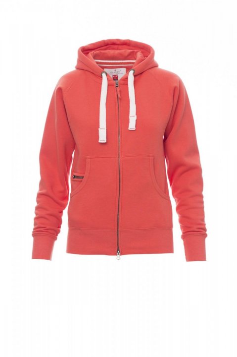 Bluza damska dopasowana z kapturem, rozpinana, zamek błyskawiczny SBS wykończony plastikiem z podwójnym suwakiem metalowym, kaptur z podwójnymi szwami i białym sznurkiem, z kontrastowymi przeszyciami i kółkami metalowymi, rękawy raglanowe, kieszenie-kangurki, kieszonka na zamek błyskawiczny, mankiety i dół ze ściągaczem, wzmocnione szwy.