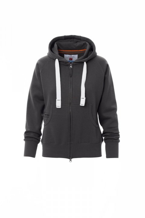 Bluza damska dopasowana z kapturem, rozpinana, zamek błyskawiczny SBS wykończony plastikiem z podwójnym suwakiem metalowym, kaptur z podwójnymi szwami i białym sznurkiem, z kontrastowymi przeszyciami i kółkami metalowymi, rękawy raglanowe, kieszenie-kangurki, kieszonka na zamek błyskawiczny, mankiety i dół ze ściągaczem, wzmocnione szwy.