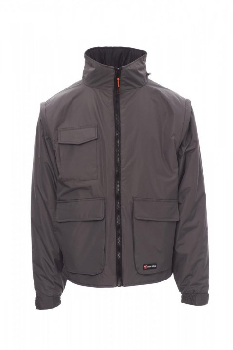 Kurtka męska, odpinane rękawy, plastikowy zamek błyskawiczny 8 mm z metalowym suwakiem, kaptur chowany w kołnierzu, elastyczne mankiety ze ściągaczami, dwie pojemne kieszenie z przodu z zapięciem LOCK SYSTEM, dwie kieszenie boczne, kieszonka na smartfon na klatce piersiowej. Od wewnątrz ocieplona, zamek błyskawiczny ułatwiający tworzenie nadruków i haftów.
