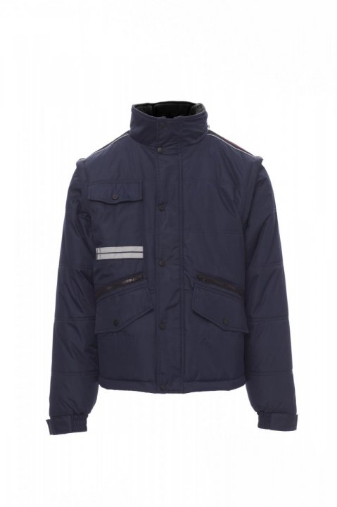 Kurtka męska, z odpinanymi rękawami, 8 mm zamek błyskawiczny plastikowy z metalowym suwakiem z patką i plastikowymi guzikami, wyprofilowane plecy, składany kaptur chowany w kołnierzu, dwie kieszenie zewnętrzne z zapięciem LOCK SYSTEM i dwie kieszenie z zamkiem błyskawicznym, kieszenie skośne zapewniające łatwiejsze wkładanie dłoni, jedna kieszonka na klatce piersiowej na smartfon z uchwytem na identyfikator, paski odblaskowe na kieszeni i na plecach. Ocieplana od wewnątrz, kontrastowa podszewka polarowa na plecach i kołnierzu, jedna kieszeń, wewnętrzny zamek błyskawiczny ułatwiający tworzenie nadruków i haftów.
