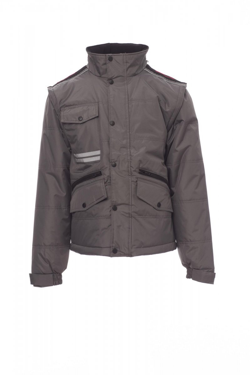 Kurtka męska, z odpinanymi rękawami, 8 mm zamek błyskawiczny plastikowy z metalowym suwakiem z patką i plastikowymi guzikami, wyprofilowane plecy, składany kaptur chowany w kołnierzu, dwie kieszenie zewnętrzne z zapięciem LOCK SYSTEM i dwie kieszenie z zamkiem błyskawicznym, kieszenie skośne zapewniające łatwiejsze wkładanie dłoni, jedna kieszonka na klatce piersiowej na smartfon z uchwytem na identyfikator, paski odblaskowe na kieszeni i na plecach. Ocieplana od wewnątrz, kontrastowa podszewka polarowa na plecach i kołnierzu, jedna kieszeń, wewnętrzny zamek błyskawiczny ułatwiający tworzenie nadruków i haftów.