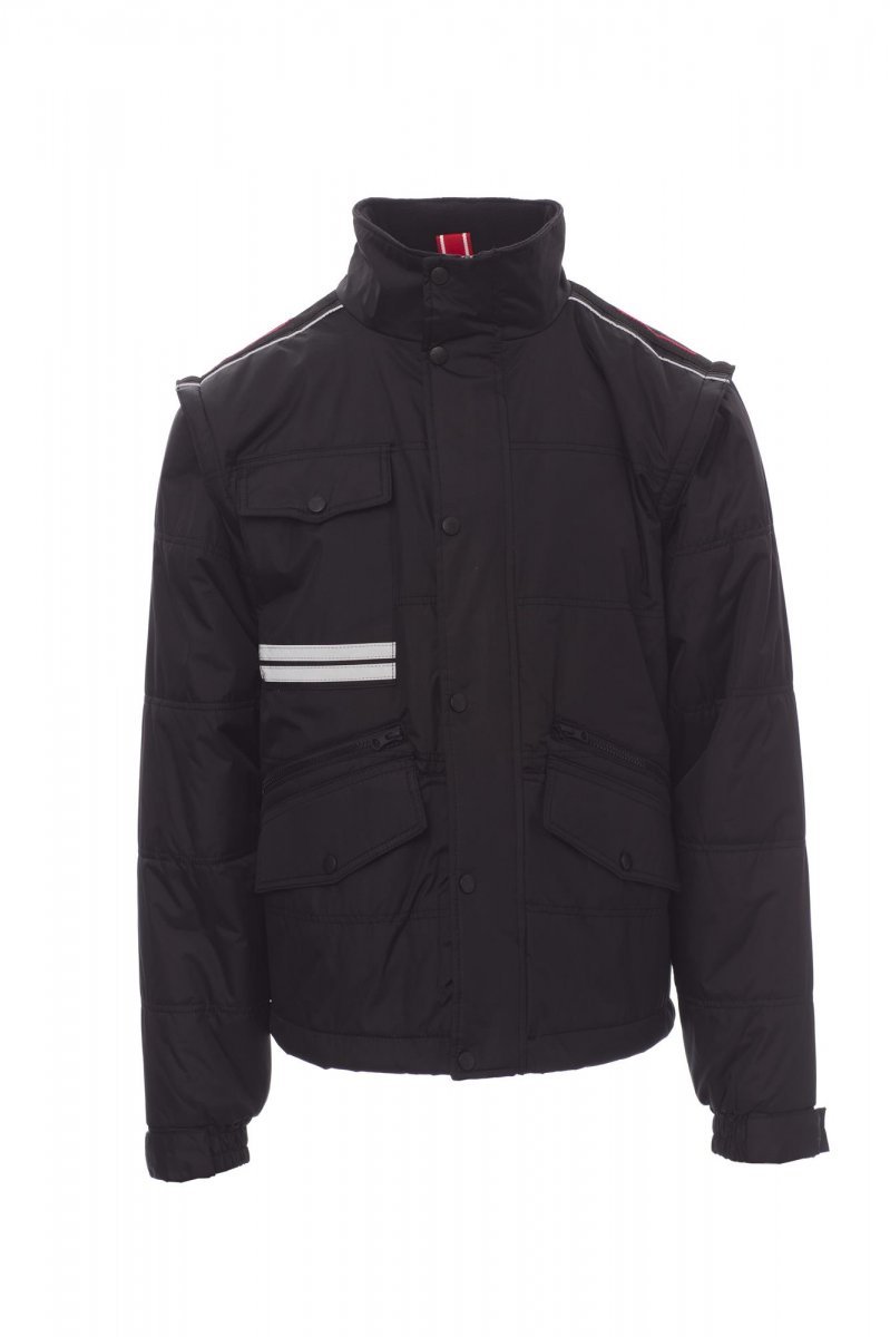 Kurtka męska, z odpinanymi rękawami, 8 mm zamek błyskawiczny plastikowy z metalowym suwakiem z patką i plastikowymi guzikami, wyprofilowane plecy, składany kaptur chowany w kołnierzu, dwie kieszenie zewnętrzne z zapięciem LOCK SYSTEM i dwie kieszenie z zamkiem błyskawicznym, kieszenie skośne zapewniające łatwiejsze wkładanie dłoni, jedna kieszonka na klatce piersiowej na smartfon z uchwytem na identyfikator, paski odblaskowe na kieszeni i na plecach. Ocieplana od wewnątrz, kontrastowa podszewka polarowa na plecach i kołnierzu, jedna kieszeń, wewnętrzny zamek błyskawiczny ułatwiający tworzenie nadruków i haftów.