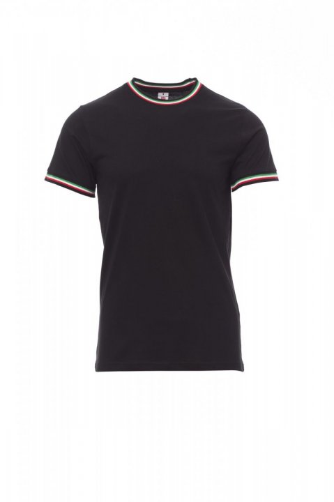T-shirt z krótkim rękawem męski, dekolt okrągły, kontrastowe obszycie kołnierzyka i rękawów (kolory flagi), z wykończeniem dekoltu w postaci taśmy 2,3 cm ściągacza z dodatkiem spandeksu, taśma wzmacniająca na całej szerokości barków