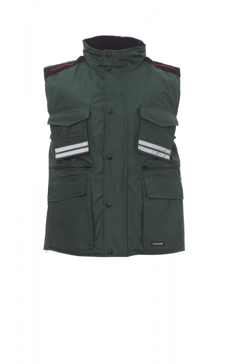 Kamizelka męska, 8 mm plastikowy zamek błyskawiczny z metalowym suwakiem, z klapką i guzikami z tworzywa sztucznego, odpinany i/lub składający się kaptur, szare paski odblaskowe z przodu i z tyłu, rozcięcie boczne z klinem i zamkiem błyskawicznym, dziewięć kieszeni zewnętrznych z czego dwie z zapięciem LOCK SYSTEM i dwie z zamkiem błyskawicznym i wzmocnieniem wewnętrznym, jedna z dwustronnym uchwytem na identyfikator