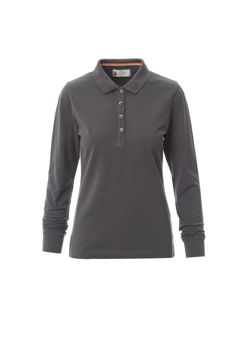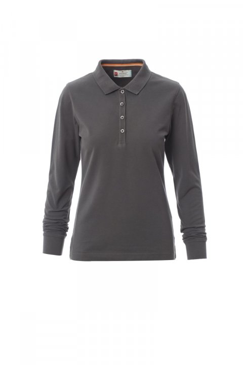Koszulka polo damska, dopasowana, z długim rękawem, z 4 pasującymi guzikami z efektem masy perłowej, kołnierzyk i krawędzie rękawów ze ściągaczem, rozcięcia boczne, zasłonięte szwy kołnierzyka z kontrastową taśmą, szwy elastyczne, boczna taśma wzmacniająca, taśma w obszyciu wewnętrznym kołnierzyka.