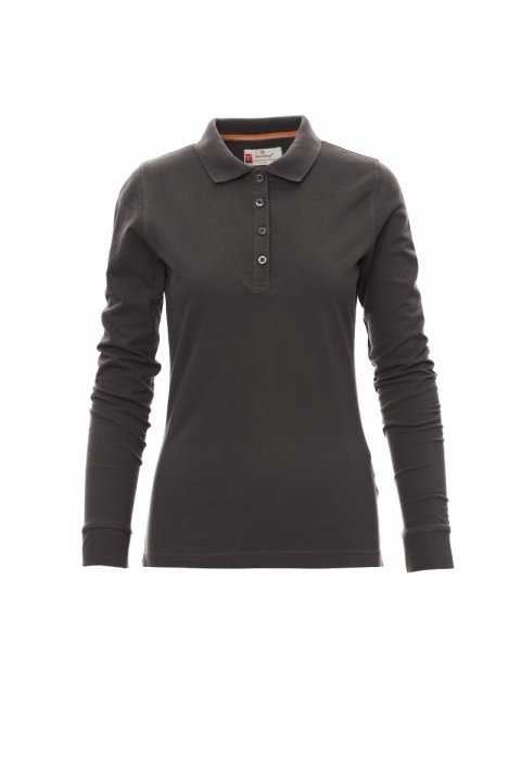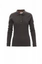 Koszulka polo damska, dopasowana, z długim rękawem, z 4 pasującymi guzikami z efektem masy perłowej, kołnierzyk i krawędzie rękawów ze ściągaczem, rozcięcia boczne, zasłonięte szwy kołnierzyka z kontrastową taśmą, szwy elastyczne, boczna taśma wzmacniająca, taśma w obszyciu wewnętrznym kołnierzyka.