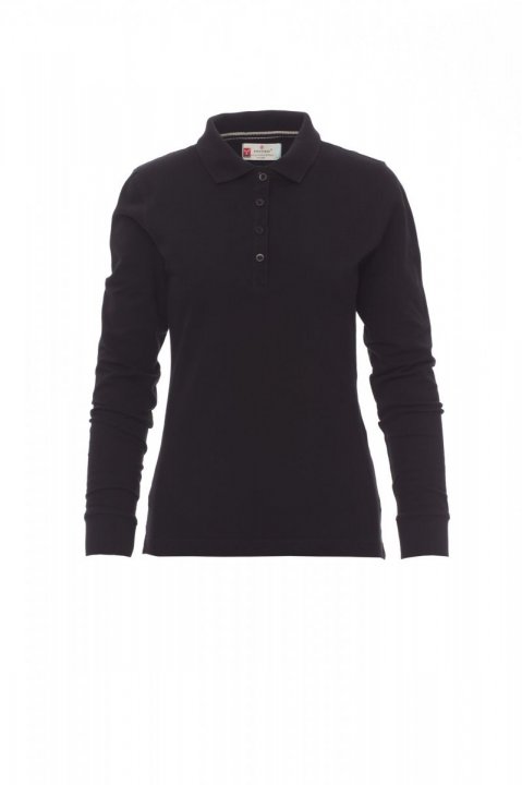 Koszulka polo damska, dopasowana, z długim rękawem, z 4 pasującymi guzikami z efektem masy perłowej, kołnierzyk i krawędzie rękawów ze ściągaczem, rozcięcia boczne, zasłonięte szwy kołnierzyka z kontrastową taśmą, szwy elastyczne, boczna taśma wzmacniająca, taśma w obszyciu wewnętrznym kołnierzyka.