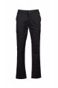 Spodnie męskie klasyczne letnie, z elastycznymi wstawkami bocznymi i szlufkami na pasek. Zapięcie na zamek błyskawiczny z guzikiem metalowym, dwie kieszenie przednie, dwie kieszenie boczne z klapkami i zatrzaskami, jedna kieszeń po lewej stronie z zamkiem błyskawicznym, jedna składana kieszonka na taśmę mierniczą po prawej stronie, dwie kieszenie tylne z rozcięciem poziomym, guzikiem i dziurką.