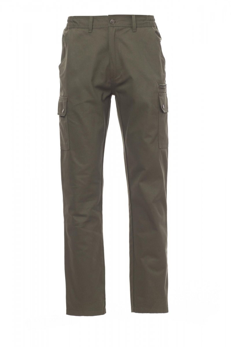 Spodnie męskie całoroczne, z elastycznymi wstawkami bocznymi i szlufkami na pasek. Zapięcie na zamek błyskawiczny z guzikiem metalowym, dwie kieszenie przednie, dwie kieszenie boczne z klapkami i zatrzaskami, jedna kieszeń po lewej stronie z zamkiem błyskawicznym, jedna składana kieszonka na taśmę mierniczą po prawej stronie, dwie kieszenie tylne z rozcięciem poziomym, guzikiem i dziurką.