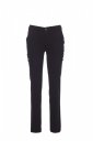 Spodnie damskie stretch o kroju klasycznym, całoroczne, gumki z boku i szlufki w talii, zapinane na zamek i guzik z metalu, z przodu dwie kieszenie o kroju klasycznym, dwie kieszenie boczne z patką i zatrzaskiem, z lewej strony kieszeń zamykana na zamek, z prawej wpuszczana kieszeń na taśmę mierniczą