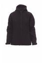 WP 8000 mm H₂O, WVT 5000 g/m² 24h. Damski 3-warstwowy soft-shell z raglanowym rękawem, zapinany na wykończony taśmą zamek błyskawiczny SBS z metalowym suwakiem. Profilowany kaptur z dwoma przeszyciami i sznurkiem ściągającym ze stoperami. Elastyczne mankiety regulowane paskami na nadgarstkach na rzep. Dwie zewnętrzne kieszenie zapinane na zamek błyskawiczny.