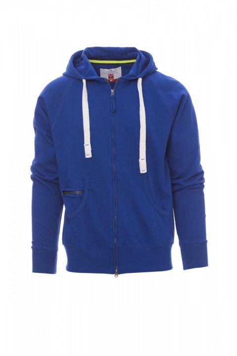 Bluza męska z kapturem, rozpinana, zamek błyskawiczny SBS zasłonięty z podwójnym suwakiem metalowym, kaptur z podwójnymi szwami i białym sznurkiem, z kontrastowymi przeszyciami i kółkami metalowymi, rękawy raglanowe, kieszenie-kangurki, kieszonka na zamek błyskawiczny, mankiety i dół ze ściągaczem, wzmocnione szwy.