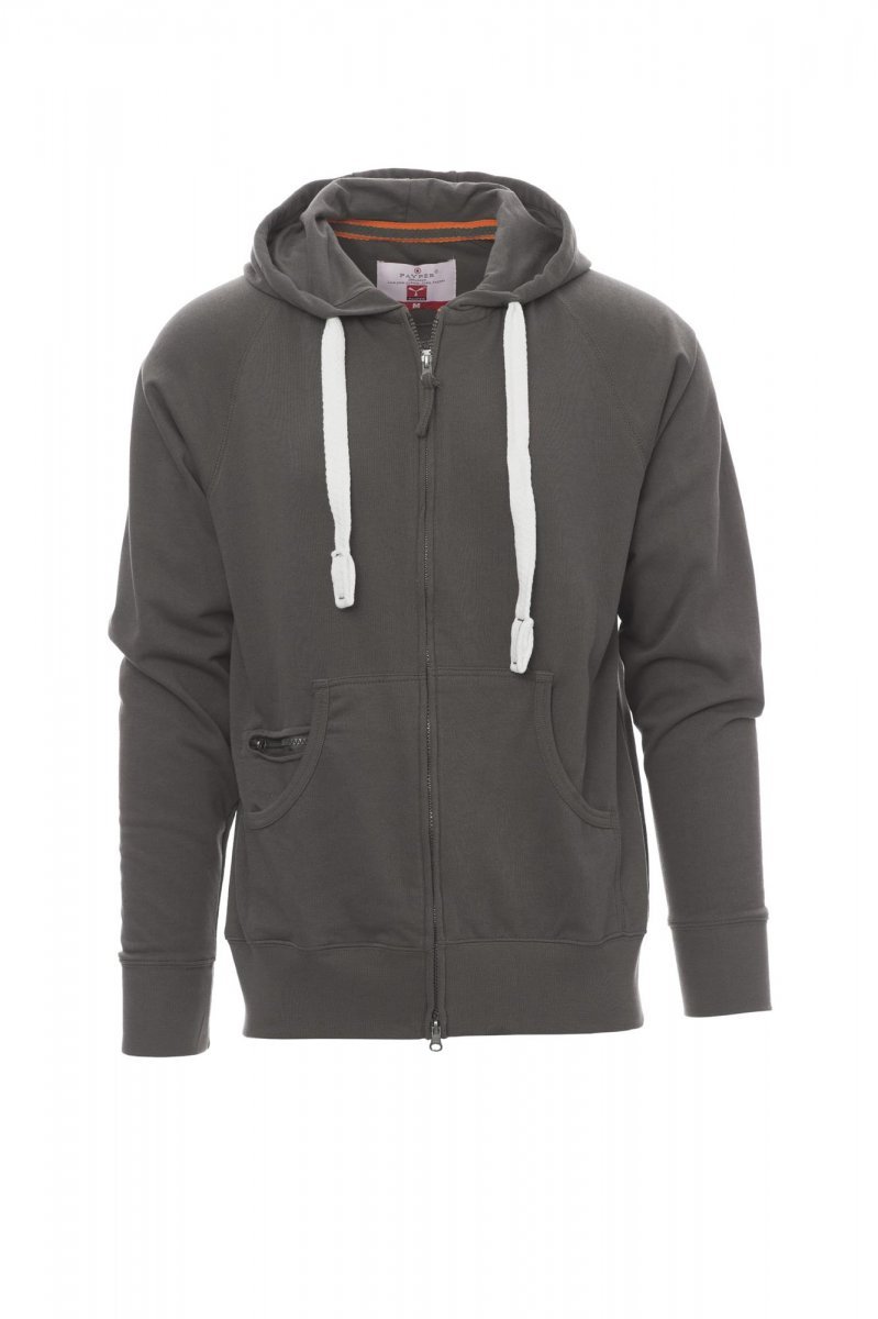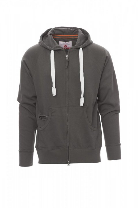 Bluza męska z kapturem, rozpinana, zamek błyskawiczny SBS zasłonięty z podwójnym suwakiem metalowym, kaptur z podwójnymi szwami i białym sznurkiem, z kontrastowymi przeszyciami i kółkami metalowymi, rękawy raglanowe, kieszenie-kangurki, kieszonka na zamek błyskawiczny, mankiety i dół ze ściągaczem, wzmocnione szwy.