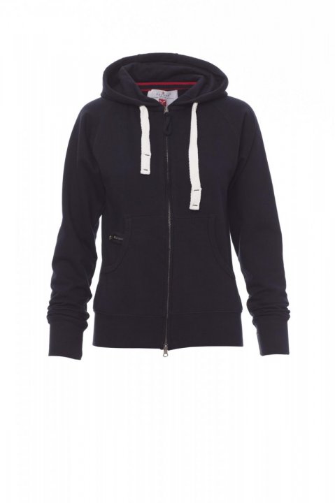 Bluza damska dopasowana z kapturem, rozpinana, zamek błyskawiczny SBS zasłonięty z podwójnym suwakiem metalowym, kaptur z podwójnymi szwami i białym sznurkiem, z kontrastowymi przeszyciami i kółkami metalowymi, rękawy raglanowe, kieszenie-kangurki, kieszonka na zamek błyskawiczny, mankiety i dół ze ściągaczem, wzmocnione szwy.