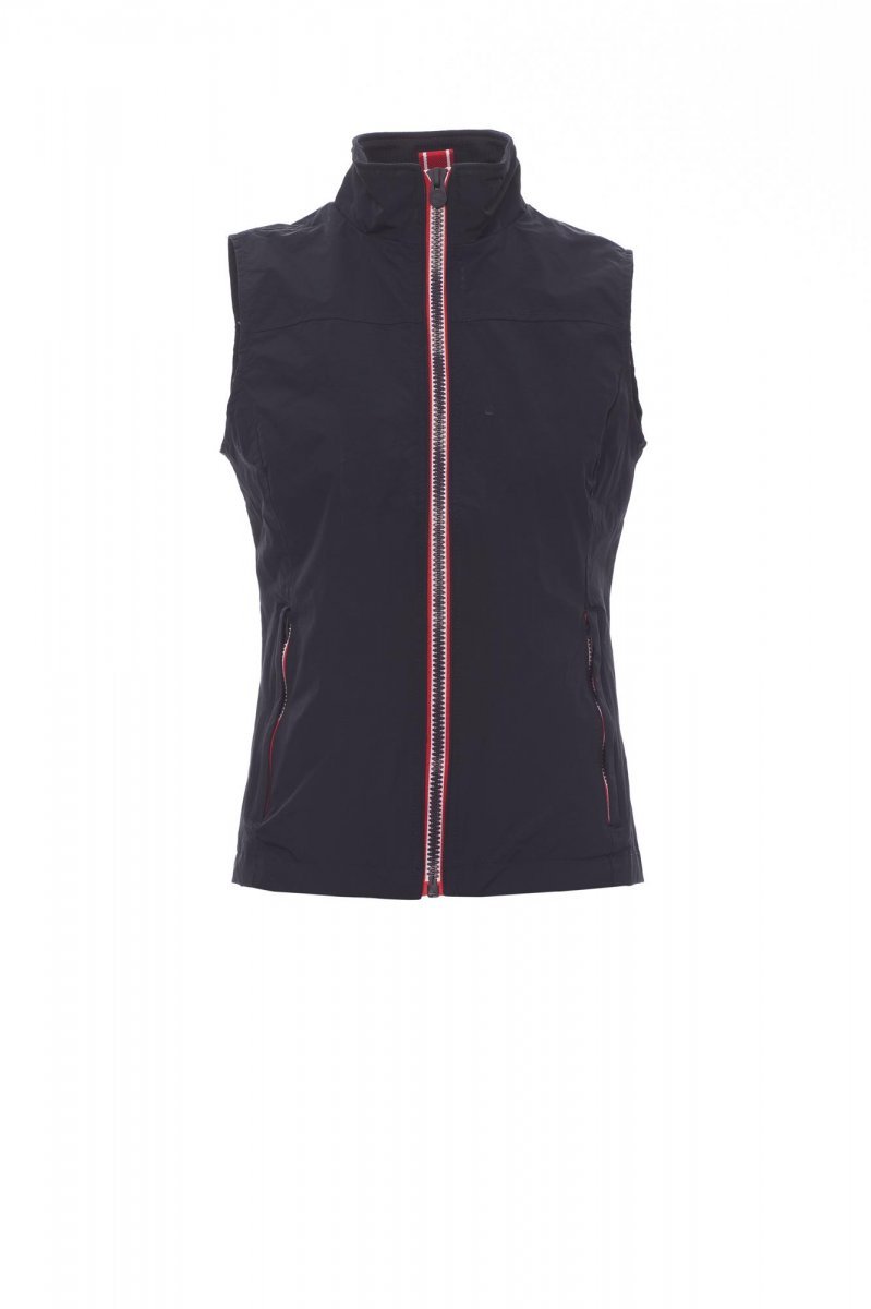 Ergonomiczna kamizelka damska, 8 mm zamek błyskawiczny w kontrastującym kolorze, dwie zewnętrzne kieszenie z zasłoniętym zamkiem błyskawicznym. Od wewnątrz nieocieplona, z podszewką siatkową, kieszonka na zamek na smartfon z miejscem na słuchawki i kabel, zamek błyskawiczny na piersi i na plecach ułatwiający tworzenie nadruków i haftów.