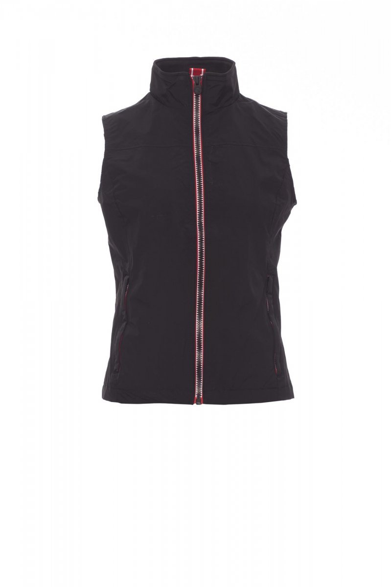 Ergonomiczna kamizelka damska, 8 mm zamek błyskawiczny w kontrastującym kolorze, dwie zewnętrzne kieszenie z zasłoniętym zamkiem błyskawicznym. Od wewnątrz nieocieplona, z podszewką siatkową, kieszonka na zamek na smartfon z miejscem na słuchawki i kabel, zamek błyskawiczny na piersi i na plecach ułatwiający tworzenie nadruków i haftów.