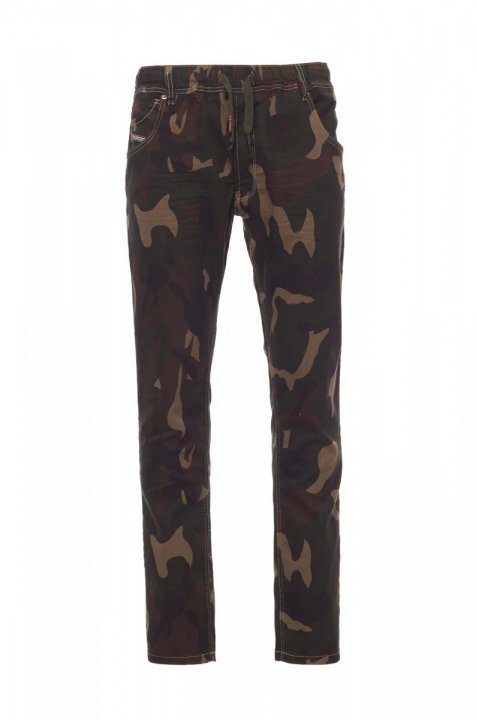 Dżinsy męskie całoroczne z pięcioma kieszeniami, z dodatkiem materiału elastycznego, sznurek i szlufki w pasie, zapinane na metalowy zamek błyskawiczny, wytarte, efekt zużycia tkaniny, przeszycia o podwyższonej trwałości, podwójne szwy na wewnętrznej stronie nogawki, nogawka wąska, zatrzaski i łaty ze skóry naturalnej. Gramatura tkaniny: 10,50 oz/yd².
