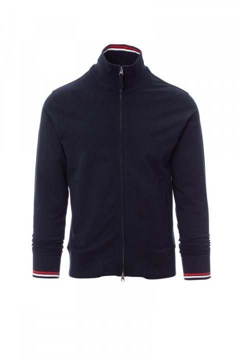 Bluza męska na zasłonięty pełny plastikowy zamek błyskawiczny z dwustronnym metalowym su-wakiem easy. Ściągacz w talii, kołnierzu i na mankietach. Wykończenie w kontrastowe paski, dwie boczne kieszenie.