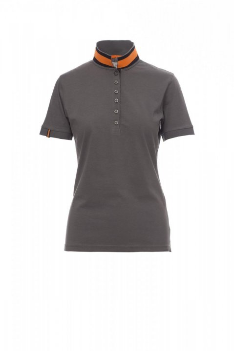 Koszulka polo damska, dopasowana, z krótkim rękawem, z 6 guzikami w kolorze materiału z efektem masy perłowej, kołnierzyk z jednej strony w kolorze materiału, z drugiej strony w kontrastowych kolorach w pasy, widocznych tylko po jego postawieniu. Kontrastowe wnętrze zapinania kołnierza i rozcięcia boczne, krawędź prawego rękawa z elegancką wstawką w kolorach kołnierza, krawędź rękawa ze ściągaczem, szwy kołnierza zasłonięte kontrastową taśmą, boczna taśma wzmacniająca, taśma w obszyciu wewnętrznym kołnierzyka.