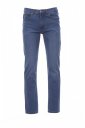 Dżinsy męskie z pięcioma kieszeniami, zapinane na metalowy zamek błyskawiczny z guzikiem, szlufki w pasie, wytarte, efekt zużytej, wypłowiałej tkaniny, kontrastujące przeszycia o podwyższonej trwałości, podwójne szwy na wewnętrznej stronie nogawki, nogawka prosta, zatrzaski i łaty ze skóry naturalnej. Gramatura tkaniny: 12 oz/yd².