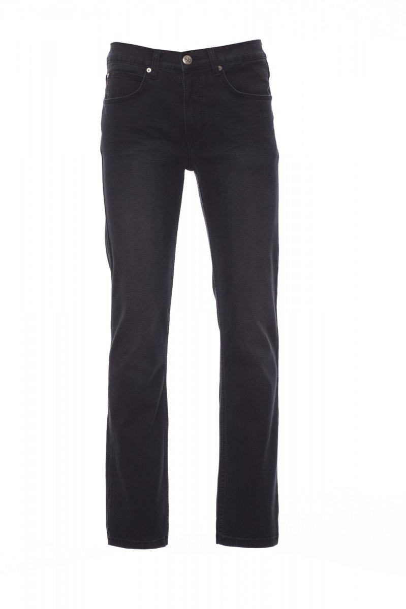 Dżinsy męskie z pięcioma kieszeniami, zapinane na metalowy zamek błyskawiczny z guzikiem, szlufki w pasie, wytarte, efekt zużytej, wypłowiałej tkaniny, kontrastujące przeszycia o podwyższonej trwałości, podwójne szwy na wewnętrznej stronie nogawki, nogawka prosta, zatrzaski i łaty ze skóry naturalnej. Gramatura tkaniny: 12 oz/yd².