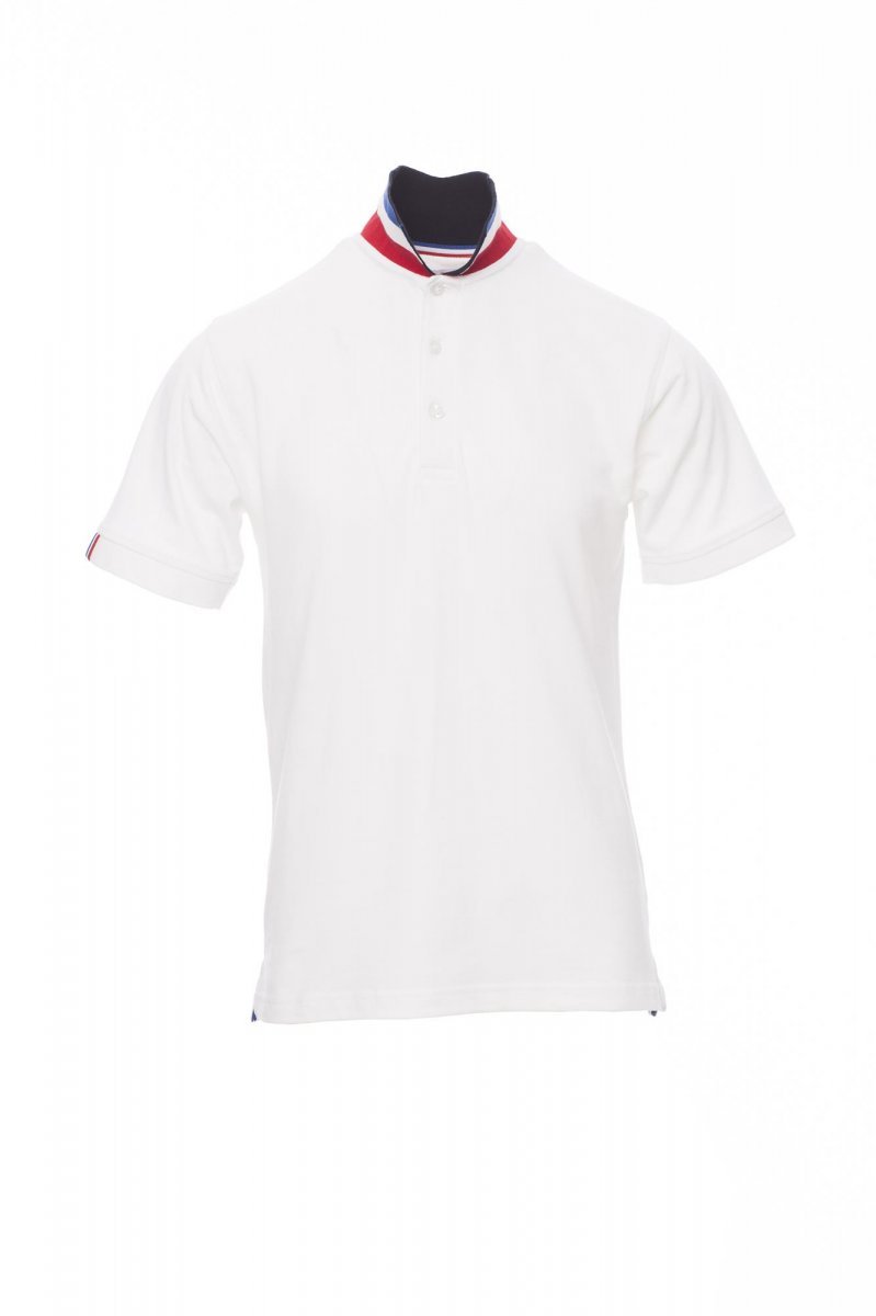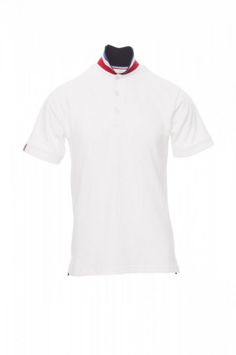 Koszulka polo męska, z krótkim rękawem, z 3 guzikami w kolorze materiału z efektem masy perłowej, kołnierzyk z jednej strony w kolorze materiału, z drugiej strony w kontrastowych kolorach włoskiej flagi, widocznych tylko po jego postawieniu, krawędź prawego rękawa z elegancką wstawką w kontrastowych kolorach włoskiej flagi, kołnierz i krawędź rękawa ze ściągaczem, rozcięcia boczne w kolorze włoskiej flagi, szwy kołnierza zasłonięte taśmą z dżerseju w kolorach włoskiej flagi, boczna taśma wzmacniająca, taśma w obszyciu wewnętrznym kołnierzyka.