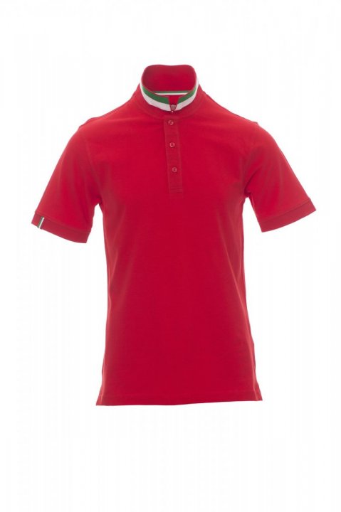 Koszulka polo męska, z krótkim rękawem, z 3 guzikami w kolorze materiału z efektem masy perłowej, kołnierzyk z jednej strony w kolorze materiału, z drugiej strony w kontrastowych kolorach włoskiej flagi, widocznych tylko po jego postawieniu, krawędź prawego rękawa z elegancką wstawką w kontrastowych kolorach włoskiej flagi, kołnierz i krawędź rękawa ze ściągaczem, rozcięcia boczne w kolorze włoskiej flagi, szwy kołnierza zasłonięte taśmą z dżerseju w kolorach włoskiej flagi, boczna taśma wzmacniająca, taśma w obszyciu wewnętrznym kołnierzyka.