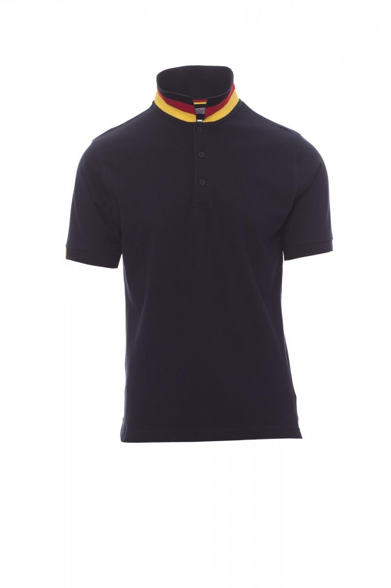 Koszulka polo męska, z krótkim rękawem, z 3 guzikami w kolorze materiału z efektem masy perłowej, kołnierzyk z jednej strony w kolorze materiału, z drugiej strony w kontrastowych kolorach włoskiej flagi, widocznych tylko po jego postawieniu, krawędź prawego rękawa z elegancką wstawką w kontrastowych kolorach włoskiej flagi, kołnierz i krawędź rękawa ze ściągaczem, rozcięcia boczne w kolorze włoskiej flagi, szwy kołnierza zasłonięte taśmą z dżerseju w kolorach włoskiej flagi, boczna taśma wzmacniająca, taśma w obszyciu wewnętrznym kołnierzyka.