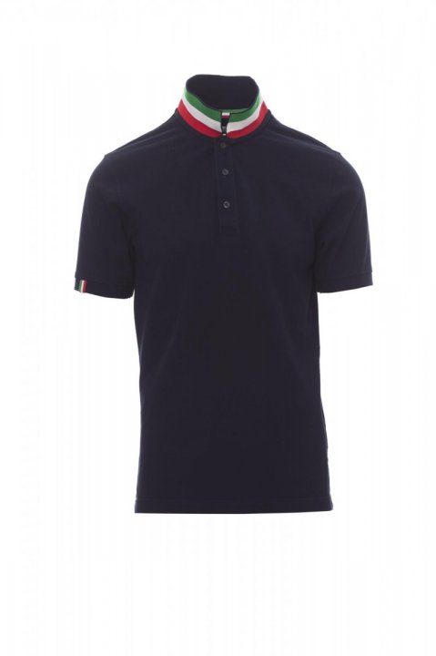 Koszulka polo męska, z krótkim rękawem, z 3 guzikami w kolorze materiału z efektem masy perłowej, kołnierzyk z jednej strony w kolorze materiału, z drugiej strony w kontrastowych kolorach włoskiej flagi, widocznych tylko po jego postawieniu, krawędź prawego rękawa z elegancką wstawką w kontrastowych kolorach włoskiej flagi, kołnierz i krawędź rękawa ze ściągaczem, rozcięcia boczne w kolorze włoskiej flagi, szwy kołnierza zasłonięte taśmą z dżerseju w kolorach włoskiej flagi, boczna taśma wzmacniająca, taśma w obszyciu wewnętrznym kołnierzyka.