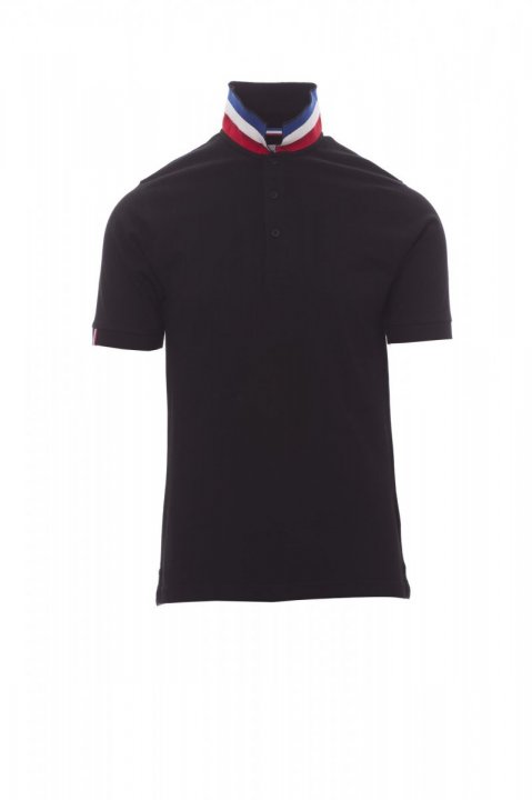 Koszulka polo męska, z krótkim rękawem, z 3 guzikami w kolorze materiału z efektem masy perłowej, kołnierzyk z jednej strony w kolorze materiału, z drugiej strony w kontrastowych kolorach włoskiej flagi, widocznych tylko po jego postawieniu, krawędź prawego rękawa z elegancką wstawką w kontrastowych kolorach włoskiej flagi, kołnierz i krawędź rękawa ze ściągaczem, rozcięcia boczne w kolorze włoskiej flagi, szwy kołnierza zasłonięte taśmą z dżerseju w kolorach włoskiej flagi, boczna taśma wzmacniająca, taśma w obszyciu wewnętrznym kołnierzyka.