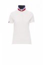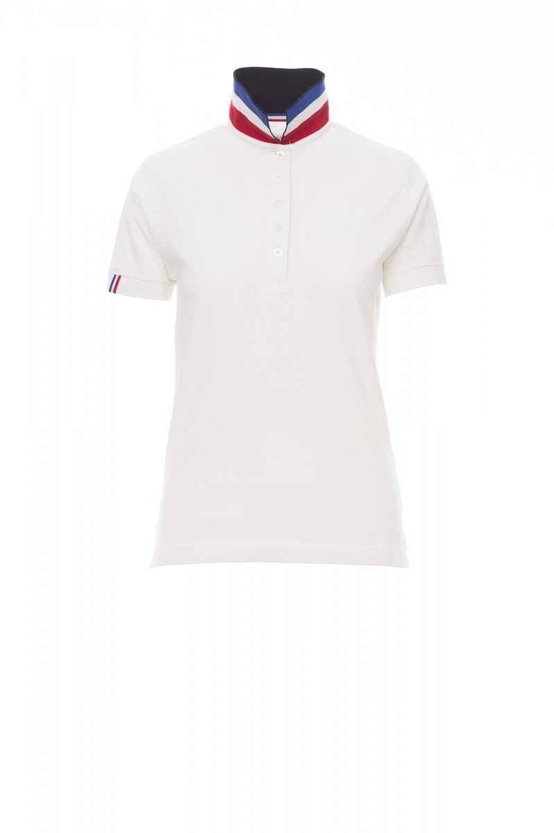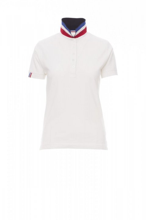 Koszulka polo damska, dopasowana, z krótkim rękawem, z 5 guzikami w kolorze materiału z efektem masy perłowej, kołnierzyk z jednej strony w kolorze materiału, z drugiej strony w kontrastowych kolorach włoskiej flagi, widocznych tylko po jego postawieniu, krawędź prawego rękawa z elegancką wstawką w kontrastowych kolorach włoskiej flagi, kołnierz i krawędź rękawa ze ściągaczem, rozcięcia boczne w kolorze włoskiej flagi, szwy kołnierza zasłonięte taśmą z dżerseju w kolorach włoskiej flagi, boczna taśma wzmacniająca, taśma w obszyciu wewnętrznym kołnierzyka.