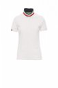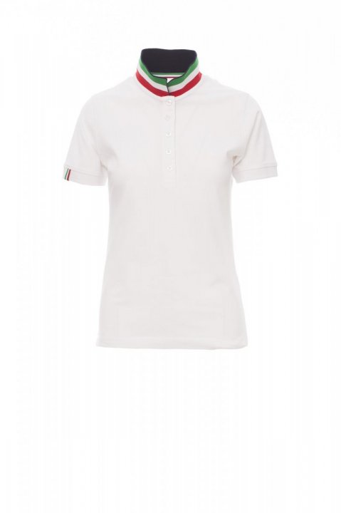 Koszulka polo damska, dopasowana, z krótkim rękawem, z 5 guzikami w kolorze materiału z efektem masy perłowej, kołnierzyk z jednej strony w kolorze materiału, z drugiej strony w kontrastowych kolorach włoskiej flagi, widocznych tylko po jego postawieniu, krawędź prawego rękawa z elegancką wstawką w kontrastowych kolorach włoskiej flagi, kołnierz i krawędź rękawa ze ściągaczem, rozcięcia boczne w kolorze włoskiej flagi, szwy kołnierza zasłonięte taśmą z dżerseju w kolorach włoskiej flagi, boczna taśma wzmacniająca, taśma w obszyciu wewnętrznym kołnierzyka.