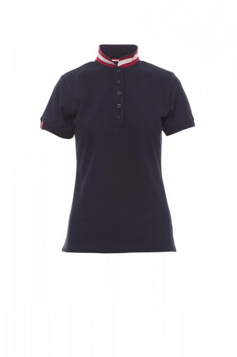 Koszulka polo damska, dopasowana, z krótkim rękawem, z 5 guzikami w kolorze materiału z efektem masy perłowej, kołnierzyk z jednej strony w kolorze materiału, z drugiej strony w kontrastowych kolorach włoskiej flagi, widocznych tylko po jego postawieniu, krawędź prawego rękawa z elegancką wstawką w kontrastowych kolorach włoskiej flagi, kołnierz i krawędź rękawa ze ściągaczem, rozcięcia boczne w kolorze włoskiej flagi, szwy kołnierza zasłonięte taśmą z dżerseju w kolorach włoskiej flagi, boczna taśma wzmacniająca, taśma w obszyciu wewnętrznym kołnierzyka.