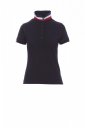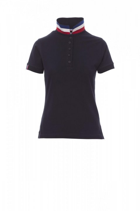 Koszulka polo damska, dopasowana, z krótkim rękawem, z 5 guzikami w kolorze materiału z efektem masy perłowej, kołnierzyk z jednej strony w kolorze materiału, z drugiej strony w kontrastowych kolorach włoskiej flagi, widocznych tylko po jego postawieniu, krawędź prawego rękawa z elegancką wstawką w kontrastowych kolorach włoskiej flagi, kołnierz i krawędź rękawa ze ściągaczem, rozcięcia boczne w kolorze włoskiej flagi, szwy kołnierza zasłonięte taśmą z dżerseju w kolorach włoskiej flagi, boczna taśma wzmacniająca, taśma w obszyciu wewnętrznym kołnierzyka.