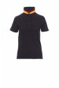 Koszulka polo damska, dopasowana, z krótkim rękawem, z 5 guzikami w kolorze materiału z efektem masy perłowej, kołnierzyk z jednej strony w kolorze materiału, z drugiej strony w kontrastowych kolorach włoskiej flagi, widocznych tylko po jego postawieniu, krawędź prawego rękawa z elegancką wstawką w kontrastowych kolorach włoskiej flagi, kołnierz i krawędź rękawa ze ściągaczem, rozcięcia boczne w kolorze włoskiej flagi, szwy kołnierza zasłonięte taśmą z dżerseju w kolorach włoskiej flagi, boczna taśma wzmacniająca, taśma w obszyciu wewnętrznym kołnierzyka.