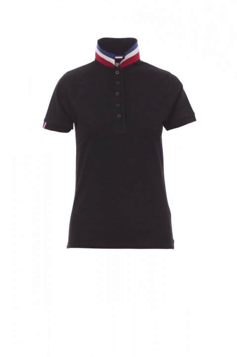 Koszulka polo damska, dopasowana, z krótkim rękawem, z 5 guzikami w kolorze materiału z efektem masy perłowej, kołnierzyk z jednej strony w kolorze materiału, z drugiej strony w kontrastowych kolorach włoskiej flagi, widocznych tylko po jego postawieniu, krawędź prawego rękawa z elegancką wstawką w kontrastowych kolorach włoskiej flagi, kołnierz i krawędź rękawa ze ściągaczem, rozcięcia boczne w kolorze włoskiej flagi, szwy kołnierza zasłonięte taśmą z dżerseju w kolorach włoskiej flagi, boczna taśma wzmacniająca, taśma w obszyciu wewnętrznym kołnierzyka.